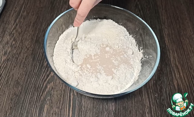 1) Соединяю муку, дрожжи и соль, хорошо перемешиваю.