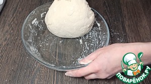 Пальцы припыляю мукой и не доставая тесто из миски, его края заворачиваю к центру и придавливаю, по кругу. Переворачиваю тесто "верх ногами".