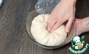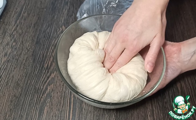 6) Через 40 мин, повторно не доставая тесто из миски, края заворачиваю к центру, придавливаю и переворачиваю его. Накрываю тесто пленкой и полотенцем и оставляю в теплом месте еще на 15-20 мин (в духовке режим "Лампочка" при 50°С).