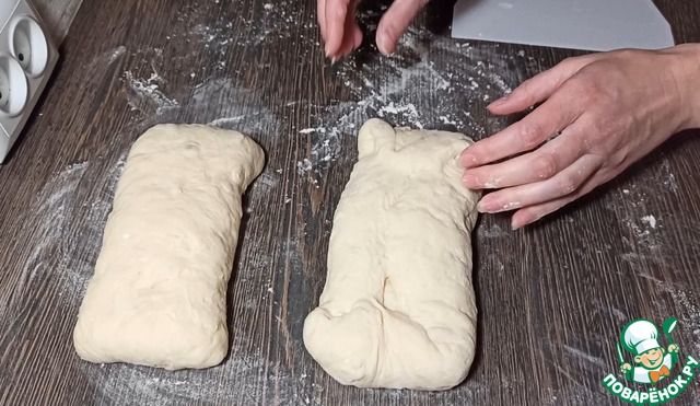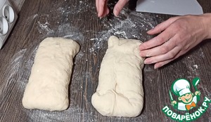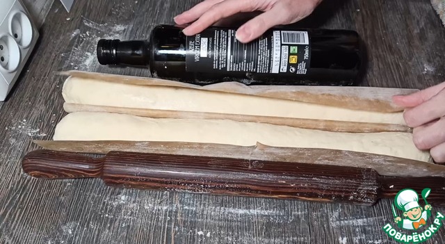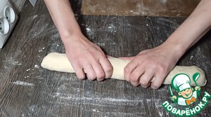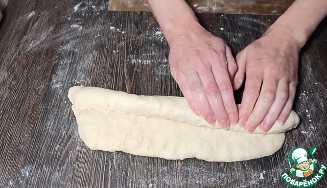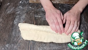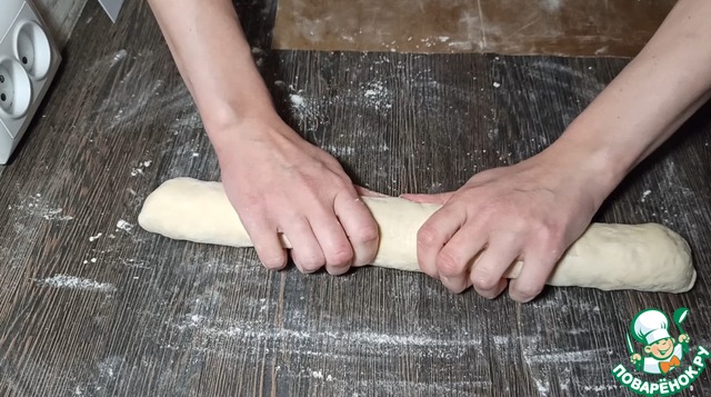 8) Через 10 мин стол и руки припыляю мукой, каждую часть нужно расплющить пальцами и закрутить в рулет. После каждый оборота "рулета" - прищипываю его к стенкам, чтобы не образовались пустоты при выпекании.