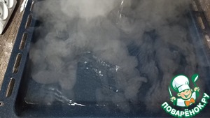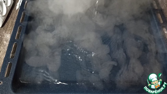 12) На противень выливаю кипяток и ставлю его на нижний уровень в духовке. Багеты ставлю на средний уровень.