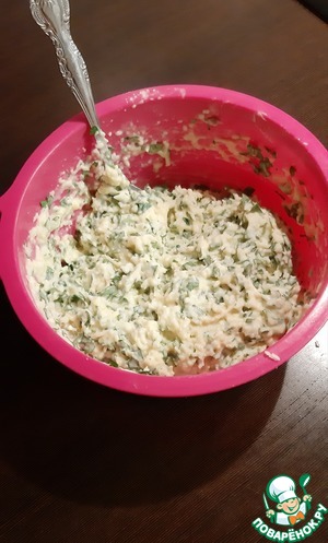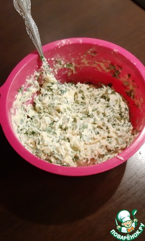 Смешать яичную смесь, сыр и зелень, можно добавить чеснок