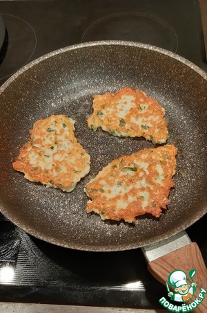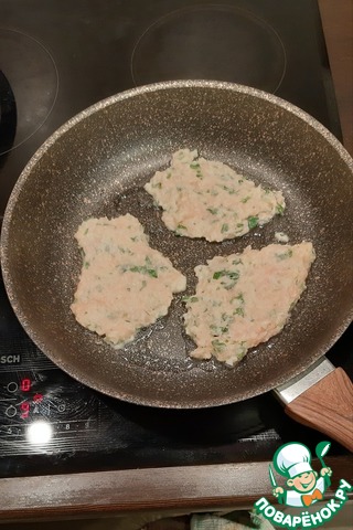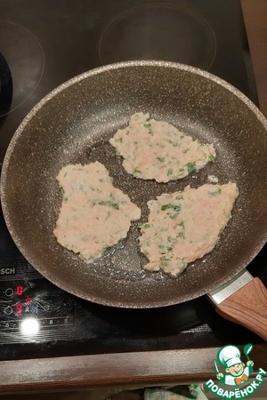 С помощью ложки выкладываем фарш на разогретую сковороду, смазанную маслом, формируя оладушки