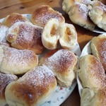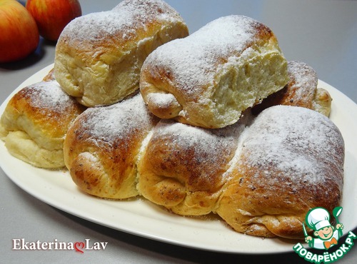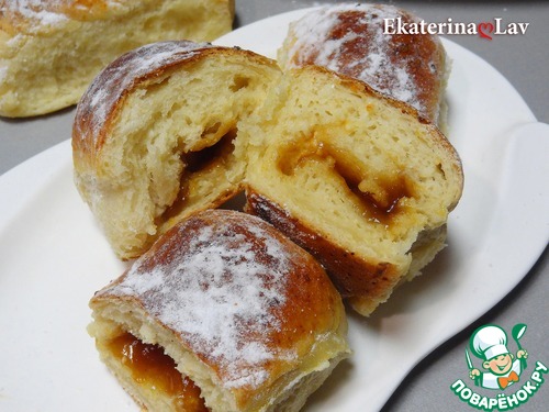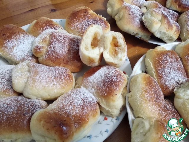 6. Спустя указанное время булочки смазываю смесью желтка с 1 ст. л молока (можно просто яйцом) и ставлю выпекаться при 180 °С на 25-30 минут. Готовые булочки по желанию посыпаем сахарной пудрой.