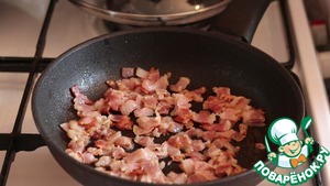 Бекон нарезаем небольшими кусочками и обжариваем на разогретой сковороде до золотистого цвета.