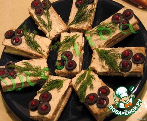 Украшаем нашу закусочку веточками укропа, кружочками маслинок и ягодками клюквы..
