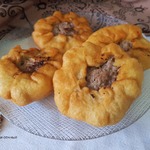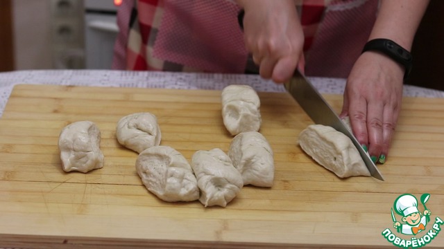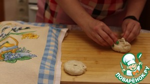 Все кусочки прикрываем полотенцем, что бы не за ветрились и начинаем лепить беляши. Из шарика делаем плоский блин, выкладываем на него начинку и закрепляем края так, что бы осталась небольшая дырочка. Так поступаем со всеми частями теста.