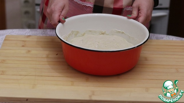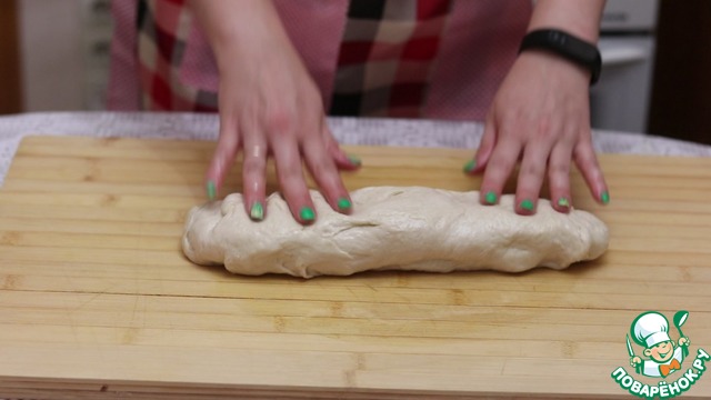 После того как тесто подойдет смазываем маслом рабочую поверхность и перекладываем на него тесто. К рукам оно перестало прилипать.