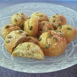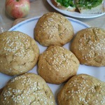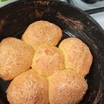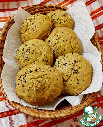 Я использую антипригарную форму для пиццы D-24 см. Визуально разделила тесто на 6 частей и отрывая от него куски, сформировала шарики D~7 см. Выложила на форму, оставляя между булочками расстояние. Они в процессе выпечки подрастут. Присыпала семечками подсолнуха. Этого делать не обязательно или можно использовать любую посыпку: кунжут чёрный или белый; тыквенные семечки... Ставим в разогретую духовку до Т-180 С на 20 минут.