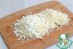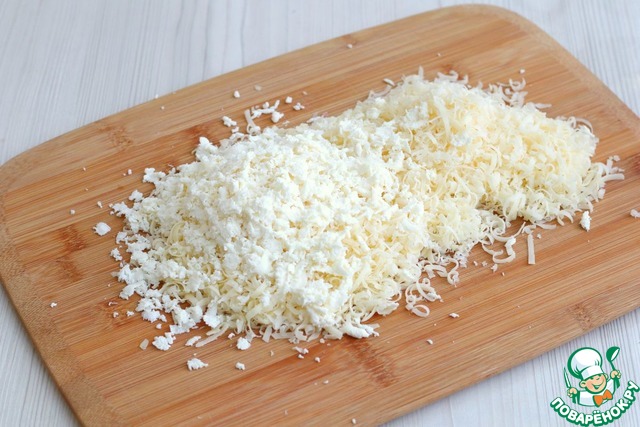 Сыр голландский (200 гр.) и моцареллу (по вкусу) натереть на средней терке. Смесь сыров перемешать.