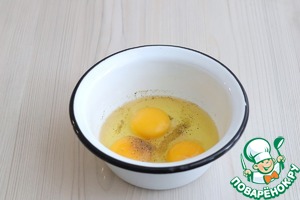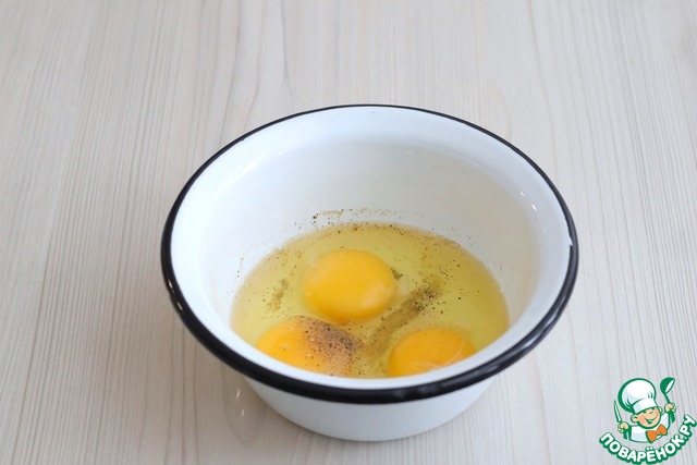 В миску добавить яйца (3 шт.), соль и белый молотый перец добавить по вкусу. Смесь взбить вилочкой.