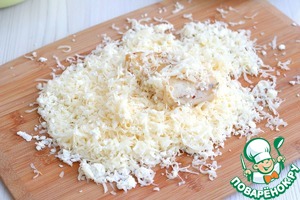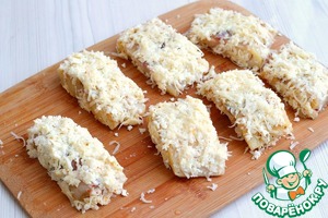 Далее филе трески обильно присыпать сырной стружкой, слегка прижать сырную панировку.