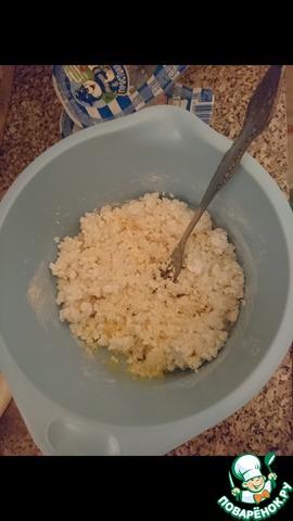 Творог, яйца, муку, сахар и соль перемешать и растереть в миске (до мелкозернистости)