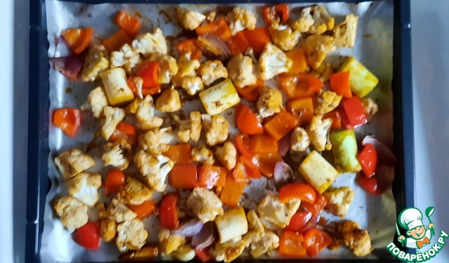 Почему цветной? Во-первых из цветной капусты, а во-вторых, посмотрите какой великолепный цвет! А запечённый, потому что овощи для него запекаются! Готовится очень просто, пока овощи стоят в духовке, можно заняться чем-то другим.
