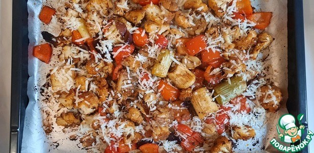 Достать овощи из духовки и сразу посыпать пармезаном. Пару кусочков капусты отложить для подачи.