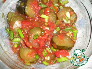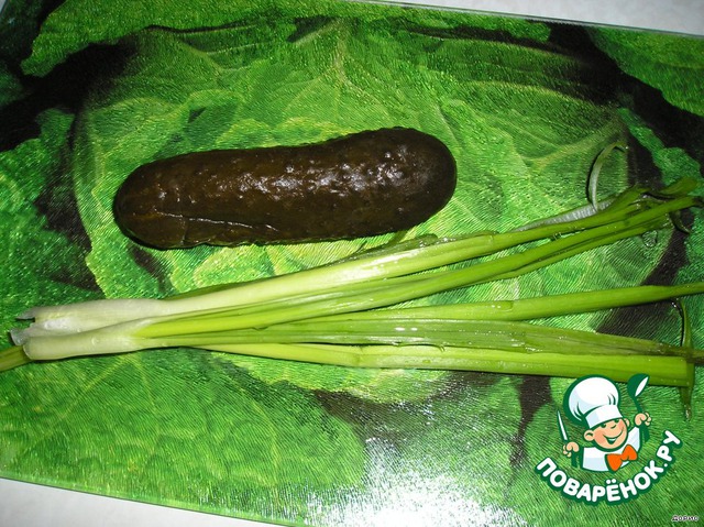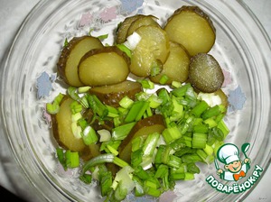 Огурец нарезаем кружочками, а лук - мелко ножницами.