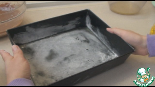 Форма у меня 24 на 28 см, смажем её подсолнечным масло, а потом посыпем мукой и распределим по форме или застелим пергаментной бумагой.