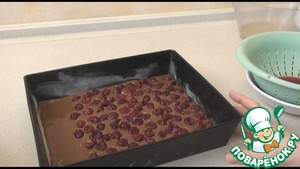Выкладываем вишню на тесто. У меня была замороженная, я её разморозила, можно брать другие ягоды, а можно и без них, просто тесто.