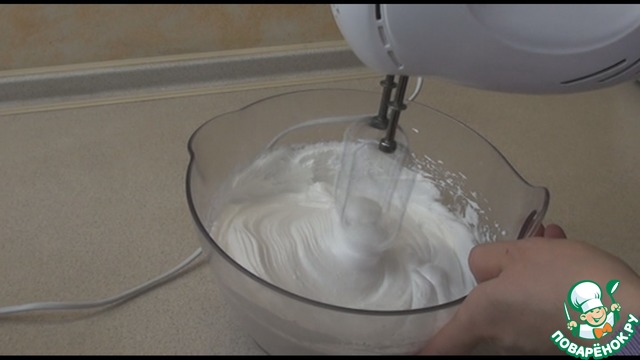 Пока печется пирог, к белкам добавляем щепотку соли и хорошо взобьём их, потом постепенно добавляем сахар, ванильку и взбиваем пока не растворится сахар и у нас не получится стойкая белая масса. Безе проверяется, если при переворачивании оно остаётся на месте, значит взбито хорошо.