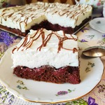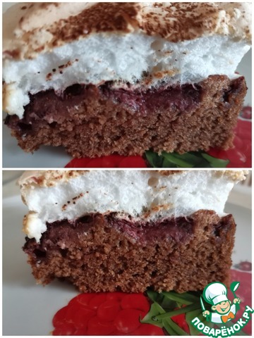 Достаём пирог из духовки и выкладываем сверху безе, прям на горячий пирог. Распределяем равномерно безе и отправляем в духовку. Уменьшаем нагрев до 100 градусов, запекаем 5-10 минут, потом откроем дверцу духовки и оставляем так пирог, чтобы остыл.