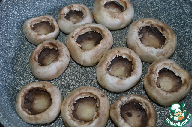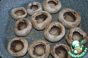 У грибов удалить ножки, выложить на разогретую сухую сковороду.