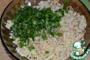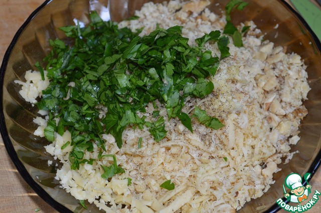 Приготовить начинку: орехи и петрушку измельчить, сыр натереть на терке, чеснок пропустить через пресс. Посолить и поперчить по вкусу, перемешать.