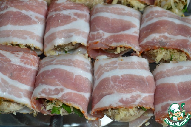 Обернуть каждую шляпку полоской бекона, выложить в форму для запекания и отправить в разогретую до 180*С духовку на 15 мин.