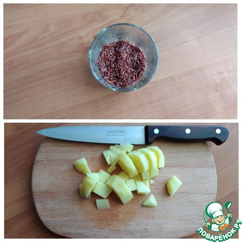 Готовка супа поэтому займёт очень мало времени. Ставим кастрюлю с процеженным бульоном 1 л на огонь, доводим до кипения и выкладываем коричневый рис. Я люблю супы густые и кто любит пожиже, налейте бульона больше. Можно долить потом, когда выложите заправку. Рис коричневый варится подольше, чем обычный. Минут через 15 выложила картофель, порезанный небольшим кубиком. -