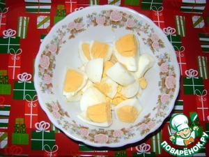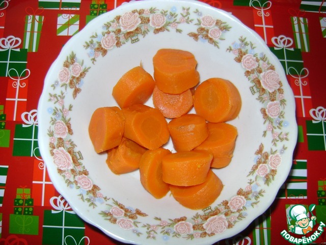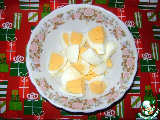 Отварить яйца и морковь. Остудить, очистить и произвольно нарезать для последующего измельчения.