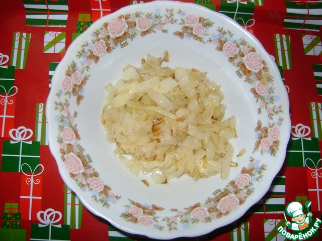 Лук мелко нарезать, обжарить в небольшом количестве (1ст. л.) растительного масла до мягкости. Дать остыть.
