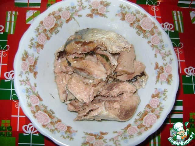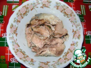 Слить жидкость из консервов. Рыбу переложить в тарелочку, удалив хребет.