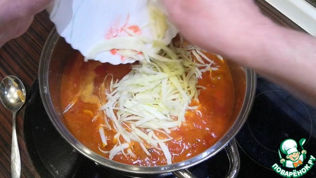 Настал момент посолить. Это делаем на данном этапе, что бы случайно не пересолить, потому как мы использовали томаты которые уже соленые. Варим 2 минуты.