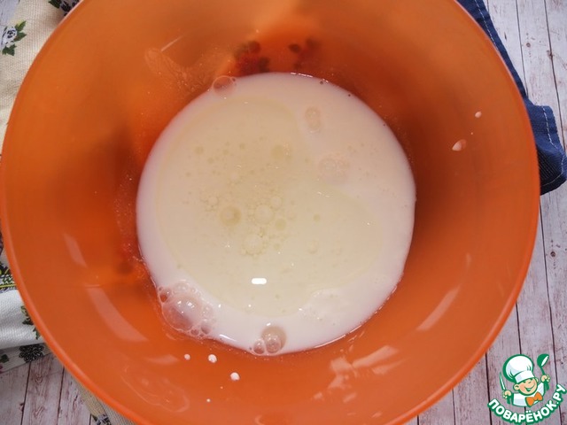 Смешиваем теплую воду, кефир, растительное масло, желток, сахар и соль. -