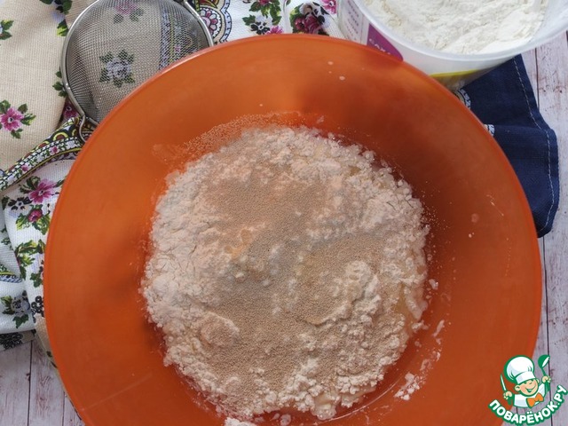 Всыпаем просеянную муку и дрожжи, замешиваем тесто.