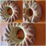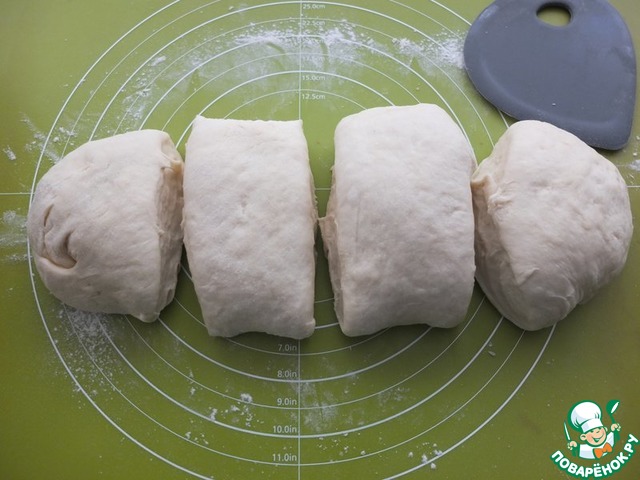 [+5]Замешивала тесто в хлебопечке. Может, поэтому получилось неплотным. При раскатке подсыпала муку, чтобы не прилипало к скалке и рукам. Поднялось отлично. На фото это полнормы всех продуктов. Будем повторять!!!! На фото вид свеху и снизу)))