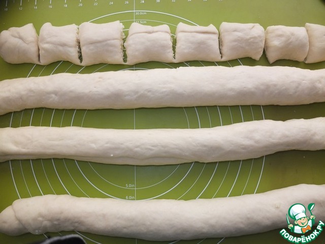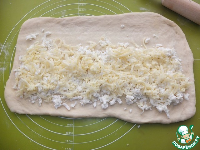 Смазываем тесто белком и выкладываем четвертую часть сыра. -