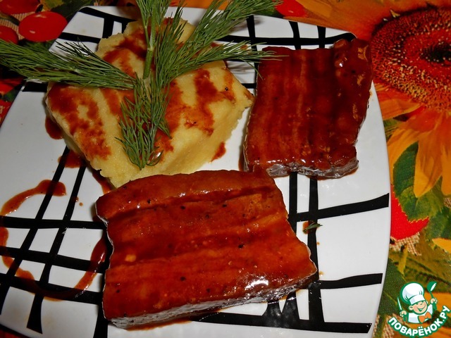 Накрываем крышкой и тушим нашу грудинку до испарения жидкости до 1/3 от первоначального об'ема. У меня ушло примерно 40 минут. За это время переворачиваем наши кусочки несколько раз, для равномерной пропитки