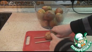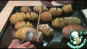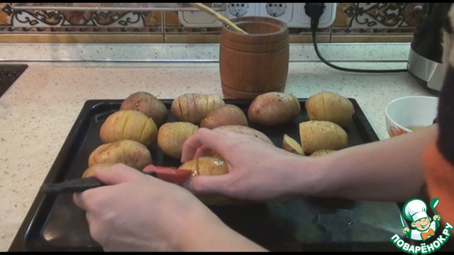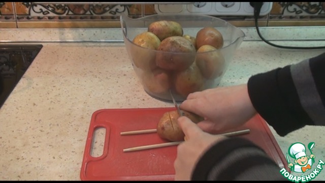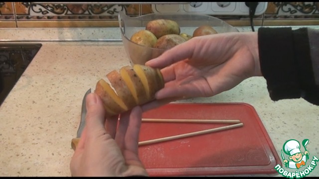 Картофель хорошо помыть и сделать надрезы, не доходя до края. Для удобства рекомендуют подложить деревянные палочки, но мне они, честно говоря не очень помогли.