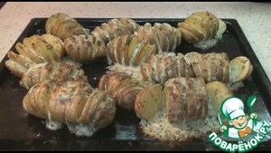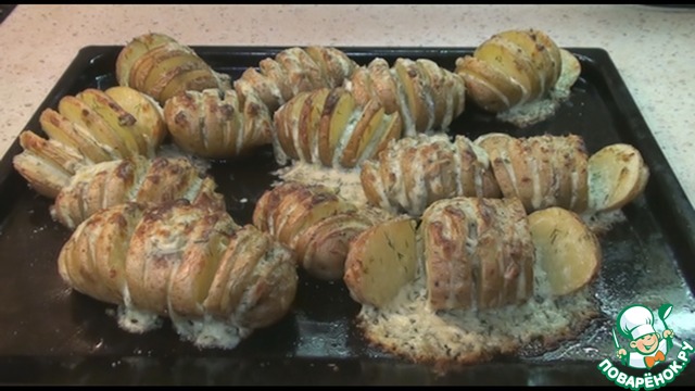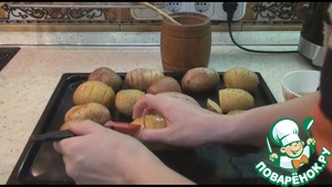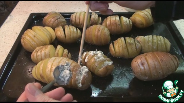 По истечении 40 минут достаем картофель из духовки и наполняем каждый разрез подготовленной смесью. Удобно это делать с помощью палочки. Сверху тоже смажем картофель смесью. Запекаем в духовке при этой же температуре 10 минут.