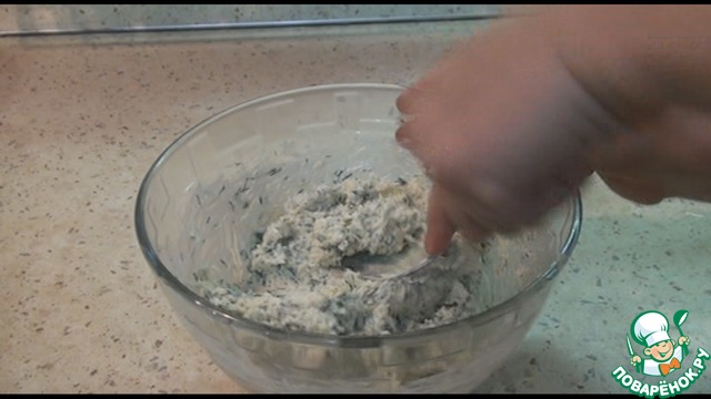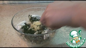 Тем временем смешаем мелко натертый сыр, нарезанный укроп, измельченный чеснок и сметану. Можно все эти ингредиенты измельчить с помощью блендера.