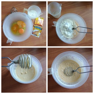 Делаем тесто. В посуду выкладываем сахар, мёд, разбиваем яйца и венчиком всё взбиваем. Я делала ручным. Просеиваем муку, добавляем ванилин и разрыхлитель, опять всё соединяем тщательно. Если тесто густое очень, а это зависит от муки, то наливаем 20 мл воды. Я долила. На фото видно, какое тесто должно быть по консистенции.