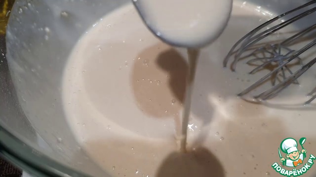 Готовое тесто, должно быть (как густые жидкие сливки) Если слишком густое - можно добавить молока или воды, если слишком жидкое - немного муки.