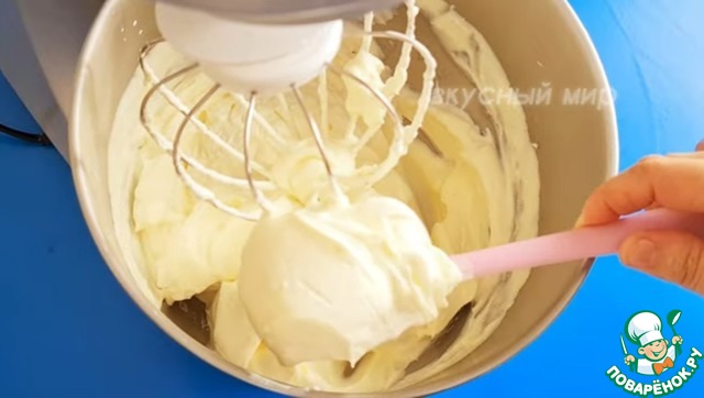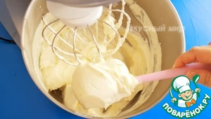 Для крема я взяла 350г сливочного сыра и 150г сахара, взбивала миксером примерно 2-3 мин. Затем добавьте сливки (33-35%), все вместе взбить до густоты. Все ингредиенты должны быть холодными!
