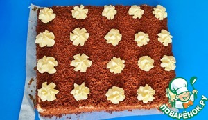 Края коржа обрезаю на крошку. Смазываем оба коржа обильно кремом. Верх и бока посыпаем крошкой. Украшайте по желанию. Обязательно дайте тортику пропитаться несколько часов в холодильнике. Радуйте себя и своих близких. Приятного аппетита!
