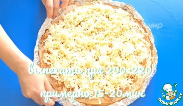 Разрезаем лепешку пополам на 2 слоя. На верхнюю часть добавляем начинку. Трем на крупной терке сыр и засыпаем на половину лепешки. Начинка на второй половинке лепёшки может быть такой же или другой. Запекаем по отдельности. Отправляем в духовку на 200-220° на 15-20 минут (режим конвекция, если есть).