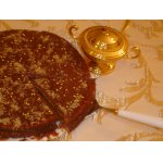 15. Смазываем одну половину кремом ( 2/3 крема), накрываем второй половиной. Оставшимся кремом смазываем края, и верх. Украшаем миндальными орехами. Торт готов. Приятного аппетита!