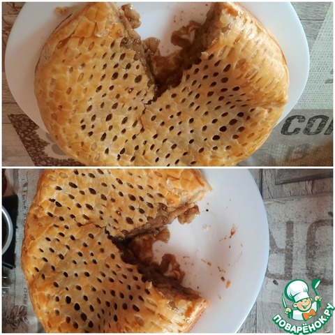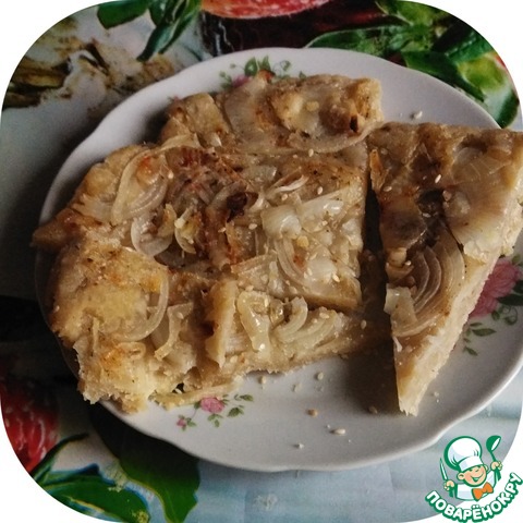 Форму или сковородку смазать маслом. Я делала в двух формах диаметром 12см. Тесто раскатать в пласт толщиной 3-4мм и уложить в форму. На тесто выложить лук. Можно сделать как открытый, так и закрытый пирог. Выпекать в духовке, разогретой до 180град 30-35 минут. Подавать вкуснее горячим или теплым.