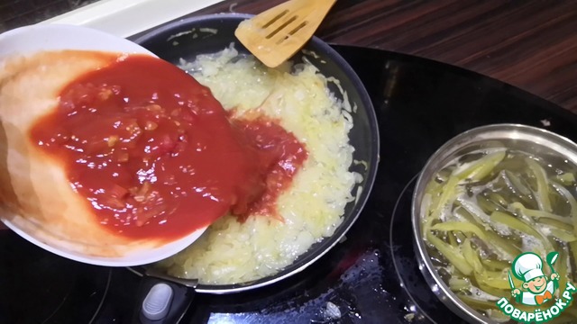 Добавляем измельченные томаты в лук. Тушим 3 минуты.