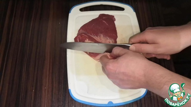 Подготавливаем говядину. Срезаем лишний жир и жилки. Разрезаем на 2 части.