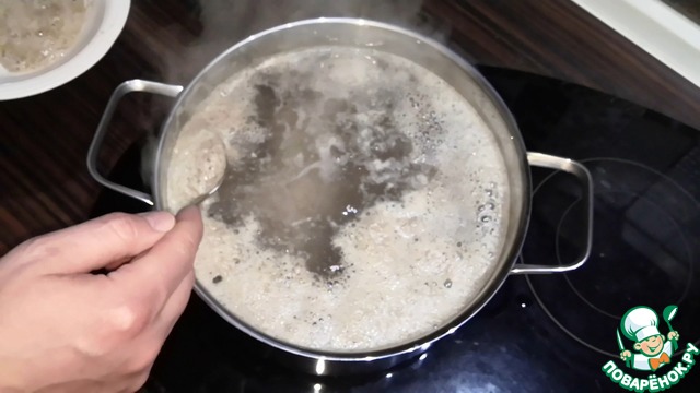 Примерно через 15 минут начнет образовываться пенка. Снимаем ее.
